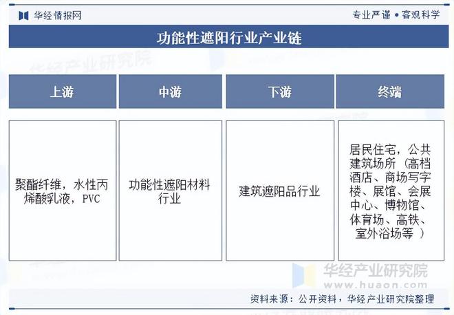 功能性遮阳材料生产行业处于产业链中心环节。功能性遮阳材料的上游为聚酯纤维、水性丙烯酸乳液、PVC等化工原料,其中聚酯纤维和PVC均为石油化工产品;下游为建筑遮阳成品行业,遮阳成品制造商采购遮阳材料后经过剪裁等加工制为成品,供应于居民住宅、公共建筑场所等终端应用领域,功能性遮阳材料处于产业链的核心环节,企业具有一定的定价权优势。
