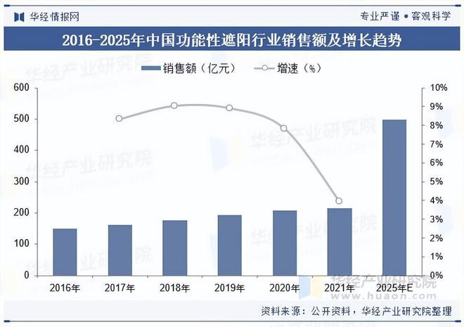 从销售规模看,2021年国内功能性遮阳产品销售额约为216.3亿元,2016-2021年复合增速为7.6%。随着国民经济持续向好发展、居民人均可支配收入不断增加及消费意愿的转变,消费者对功能性遮阳行业了解和接受程度上升,市场渗透率有望提升。预计2025年中国功能性遮阳产品销售额规模有望达到500亿元。