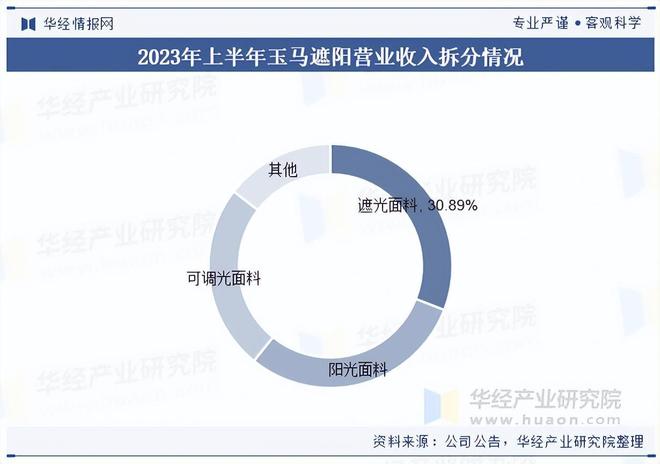 山东玉马遮阳科技股份有限公司成立于2014年,是一家集高分子功能性遮阳新材料的研发、生产、销售及进出口贸易于一体的高新技术企业。自成立以来,公司一直专注于功能性遮阳材料的研发、生产和销售,主要产品包括遮光面料、可调光面料和阳光面料,集遮阳、节能、环保等多功能为一体,兼具抗菌、防污、除甲醛等特殊功能,符合国家科技创新和产业发展的方向,属于重点发展的战略性新兴产业。从营收情况来看,2023年上半年公司营业收入达到3.04亿元,其中遮光面料/阳光面料/可调光面料收入占比分别为30.89%、29.91%和24.63%。