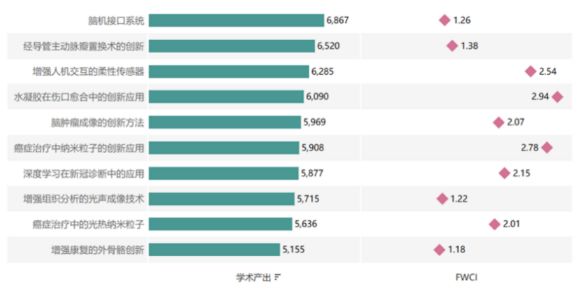 数据显示,医疗器械领域的研究热点体现出显著的学科交叉与技术融合趋势,“脑机接口系统”“经导管主动脉瓣置换术的创新”“增强人机交互的柔性传感器”和“水凝胶在伤口愈合中的创新应用”等位列全球高产出主题,涵盖了智能医学信号处理、新材料传感器、先进介入设备和再生医学等方向。